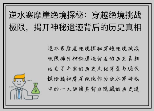 南部溪谷是自然界的一颗明珠,它不仅因其独特的地理位置而闻名,更因其周边丰富多样的自然景观而成为众多探险者和自然爱好者的向往之地。本文将全面探索南部溪谷的地理位置以及其周围的自然景观,通过四个方面进行详...